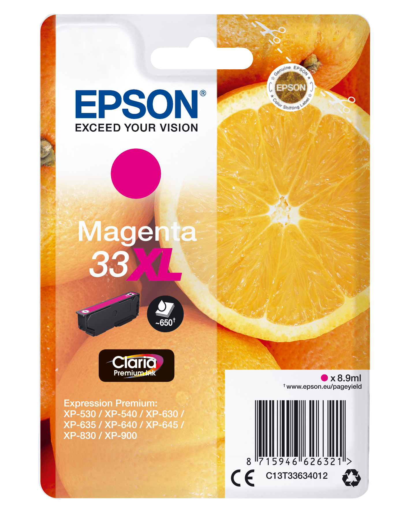Epson Oranges C13T33634012, Højt (XL) udbytte, Magenta, Pigmentbaseret blæk, 8,9 ml, 1 stk, 650 Sider